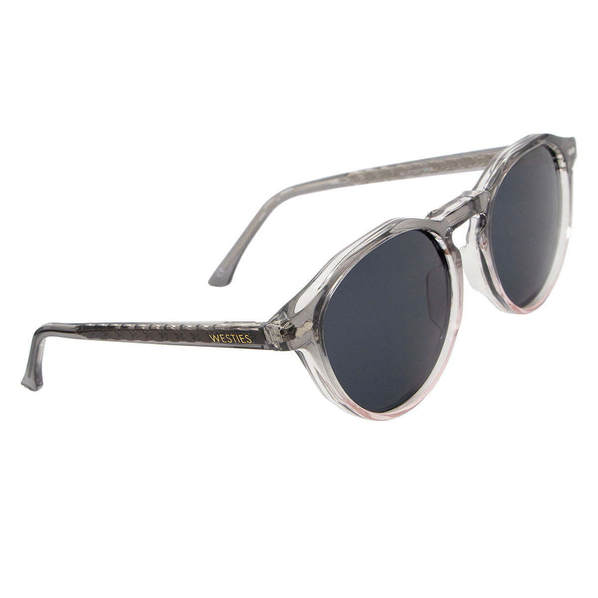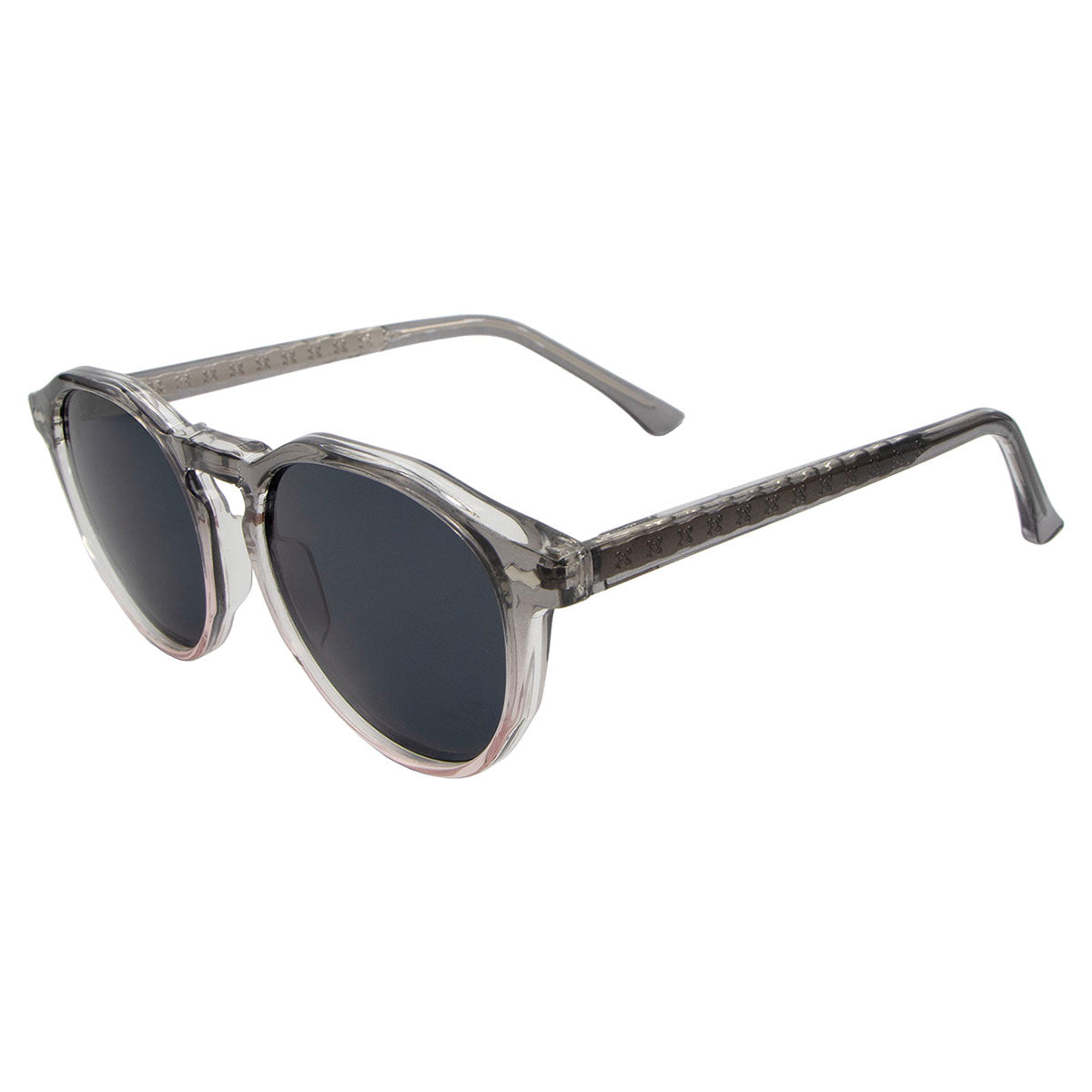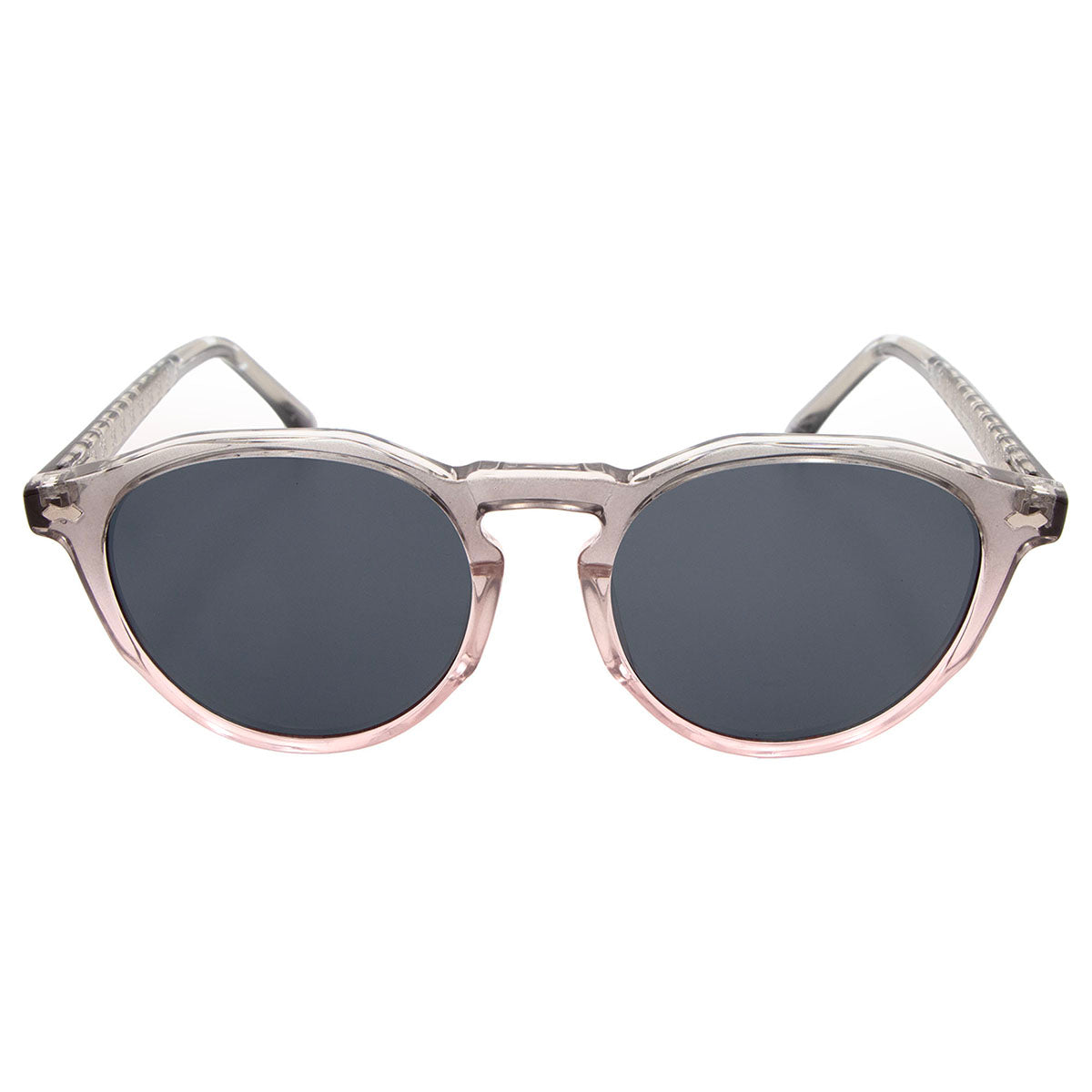 Lentes de sol redondos en pasta gris-rosa.